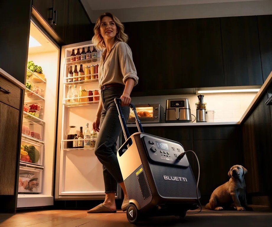 The Elite 320 has a suitcase-style design with 3.2kWh capacity and 1,800W output. It can run refrigerators, Wi-Fi, and kitchen appliances. Built-in wheels and a telescopic handle make it easy to move from room to room.