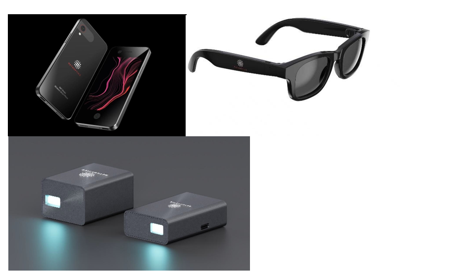 The main product is a 5G smartphone with a metalens optical module. Its camera sits flush with the phone, so there is no camera bump. The glass-based design is heat-resistant. The phone also has a non-contact 3D fingerprint module that lets you map fingerprints without touching the sensor. The demonstration unit uses the Qualcomm Dragonwing QCM6490, a chip designed for IoT that works across different operating systems. - Rectangular Metalens on a 12-Inch Glass Wafer