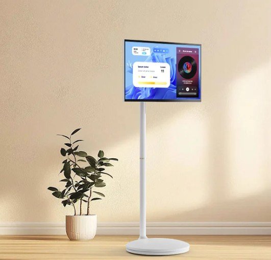 Mobility is a key feature. Five silent casters let users move the TV between rooms without making a sound. The built-in battery provides up to eight hours of wireless use, so it works in any room without needing to stay plugged in.