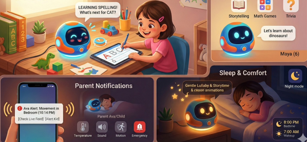 A learning partner like the Tbot can support guided discovery and help children explore topics of interest in an age-appropriate way. It can also be a sleep companion that promotes a calm bedtime routine, including telling age-appropriate stories to help children settle.